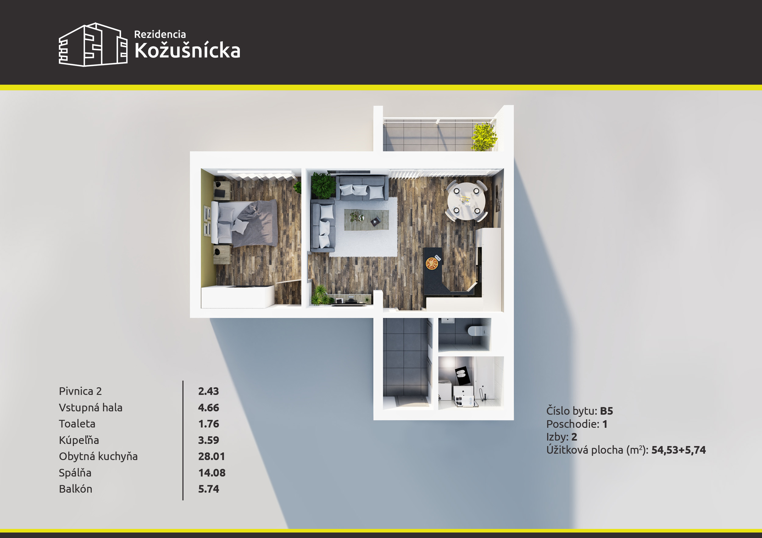 Zobraziť väčší obrázok B – Byt č. 5 2-izbový byt 54,53 m2 + balkón REZERVOVANÉTechnická dokumentácia na stiahnutie: • Pôdorys poschodia 1 – 4 np. bytový dom B • Celková situácia bytových domov • Podzemné parkovisko bytový dom B • Dokončenie 2-izbového bytu do štandardu Zajo2024-06-26T11:52:16+02:001.NP-B, 2-izbové byty, Rezervované, VYPREDANÉ - Bytový dom B| Zdieľajte s priateľmi Facebook